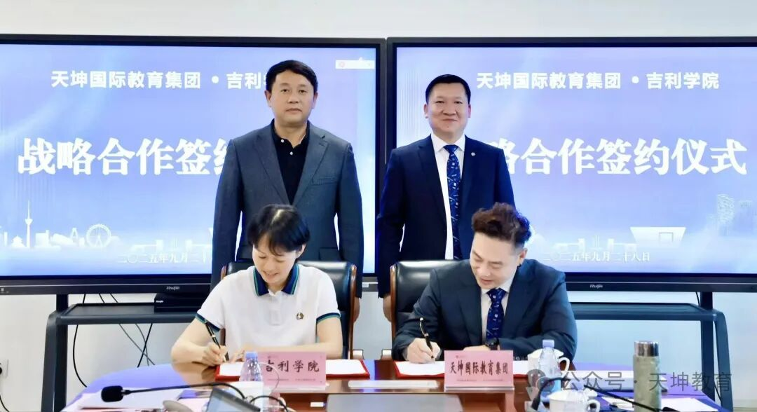 時維九月,序屬三秋。2025年9月28日下午,天坤國際教育集團與吉利學院隆重舉行戰略合作簽約儀式。雙方宣布將充分發揮各自優勢,在共建生源基地、中高本貫通培養、特色產業學院、產教融合基地等多個領域開展深度合作,共同打造校企合作、產教融合的新標桿,為區域經濟社會發展培養和輸送高素質技術技能人才。天坤國際教育集團董事長王云雷、吉利學院校長闕海寶等雙方主要領導共同出席了簽約儀式。